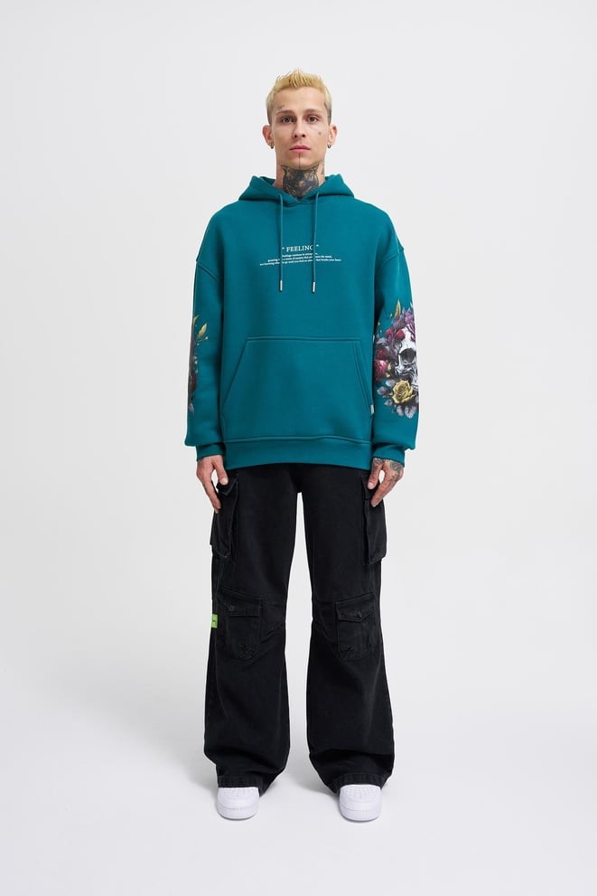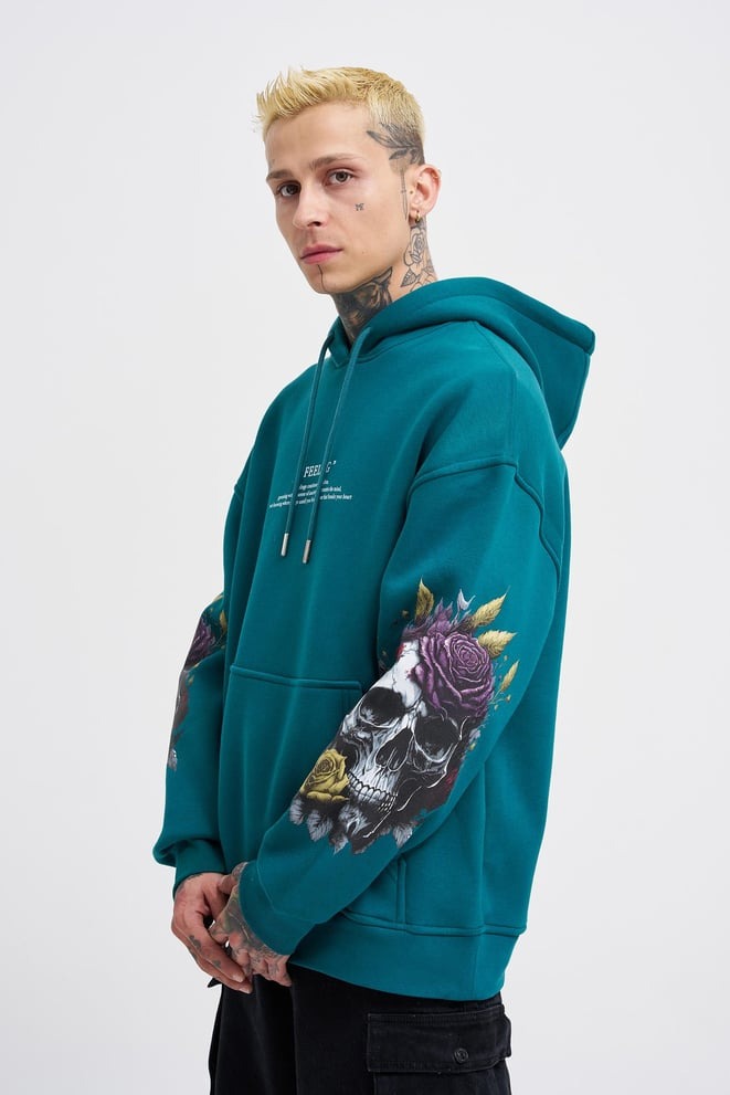 Stand out from the crowd. The teal hoodie is a fresh take on urban wear, with unique floral skull designs that pop
